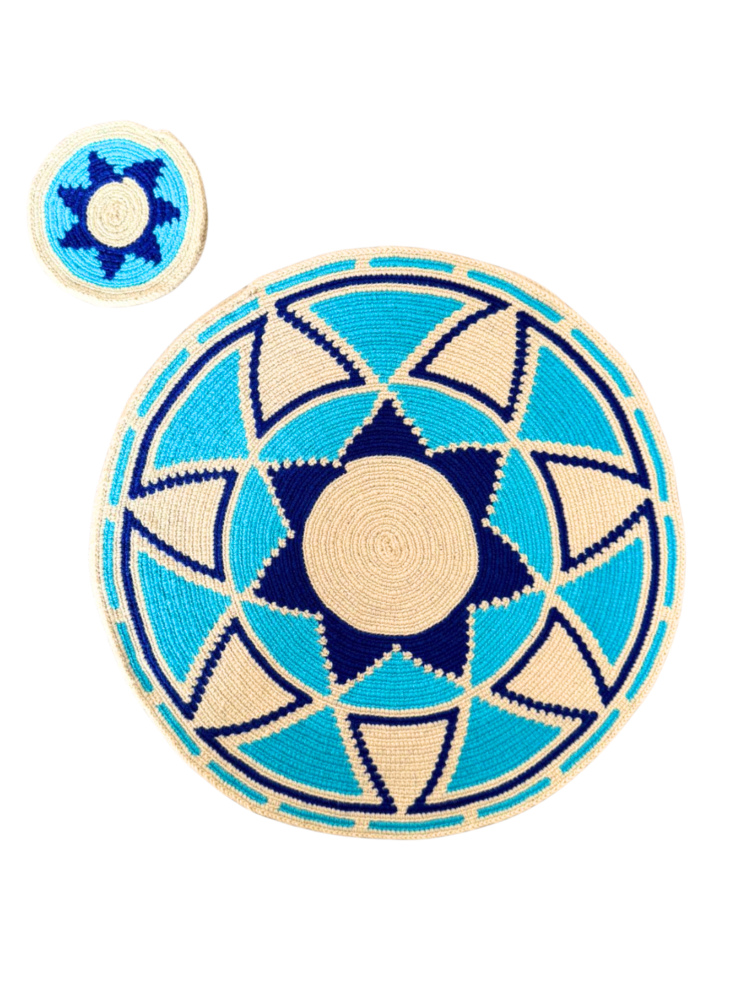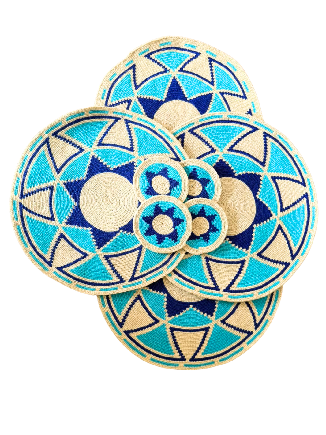 Individuales circulares (35 cm) y portavasos (11cm). Set x 4. Elaborados en hilo con diseños Wayúu. Al ser elaborados artesanalmente por diferentes personas, las dimensiones pueden variar ligeramente, con una tolerancia de ±3 cm.