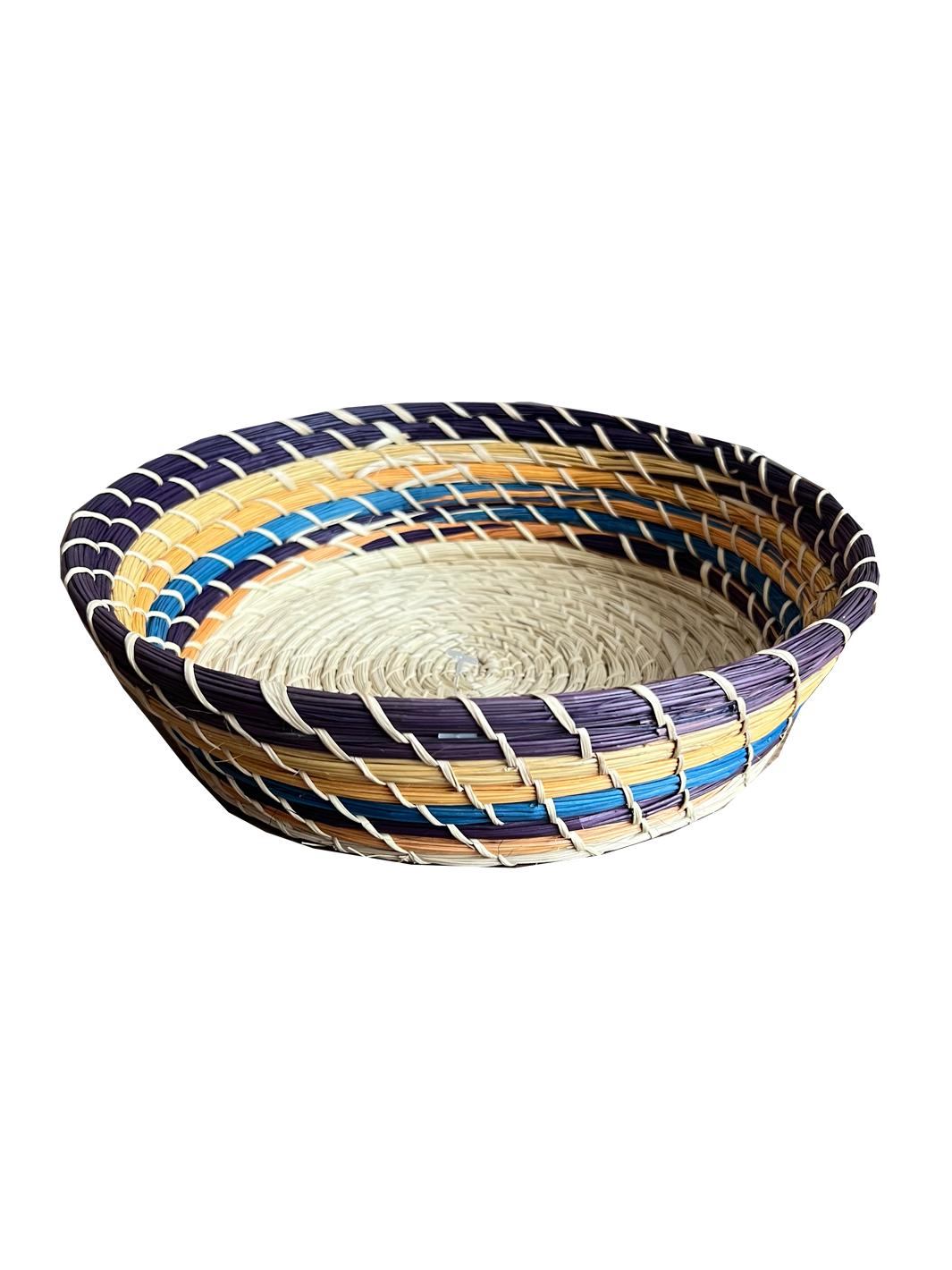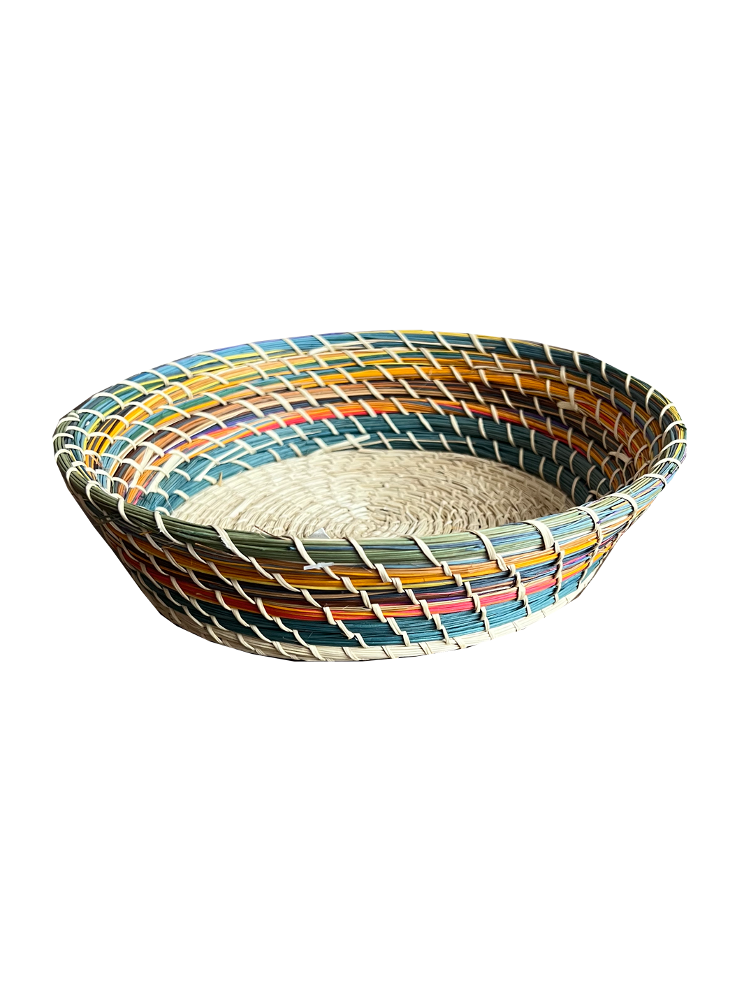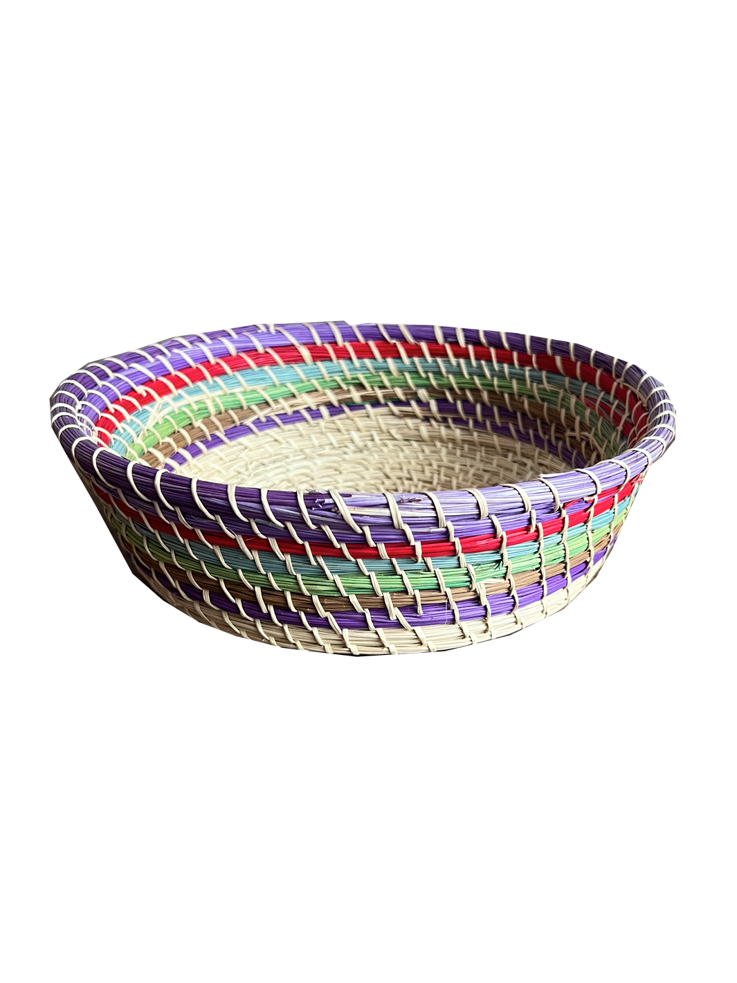 Canastos tejidos en palma de Iraca, pintados en diversos colores. Fueron tejidos en el Putumayo por 6 mujeres que iniciaron tejiendo sombreros de Iraca en las ruinas de la casa de una de las asociadas destruida por la avalancha en el barrio San Miguel en Mocoa. Poco a poco, gracias a su dedicación y perseverancia, avanzaron con otros productos y hoy se destacan por su calidad e innovación. Buscan recuperar, conservar y transmitir las tradiciones campesinas en especial los tejidos de Iraca