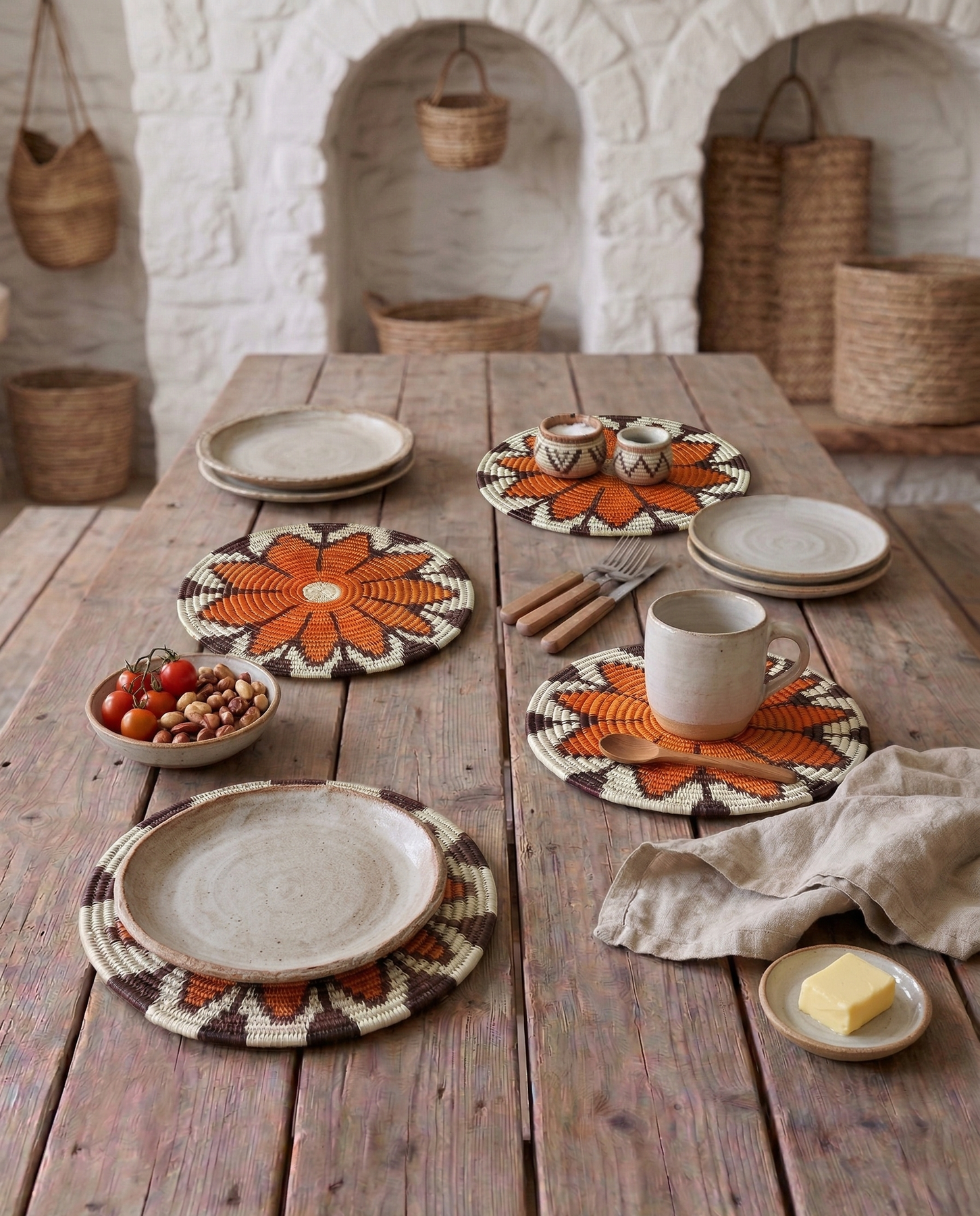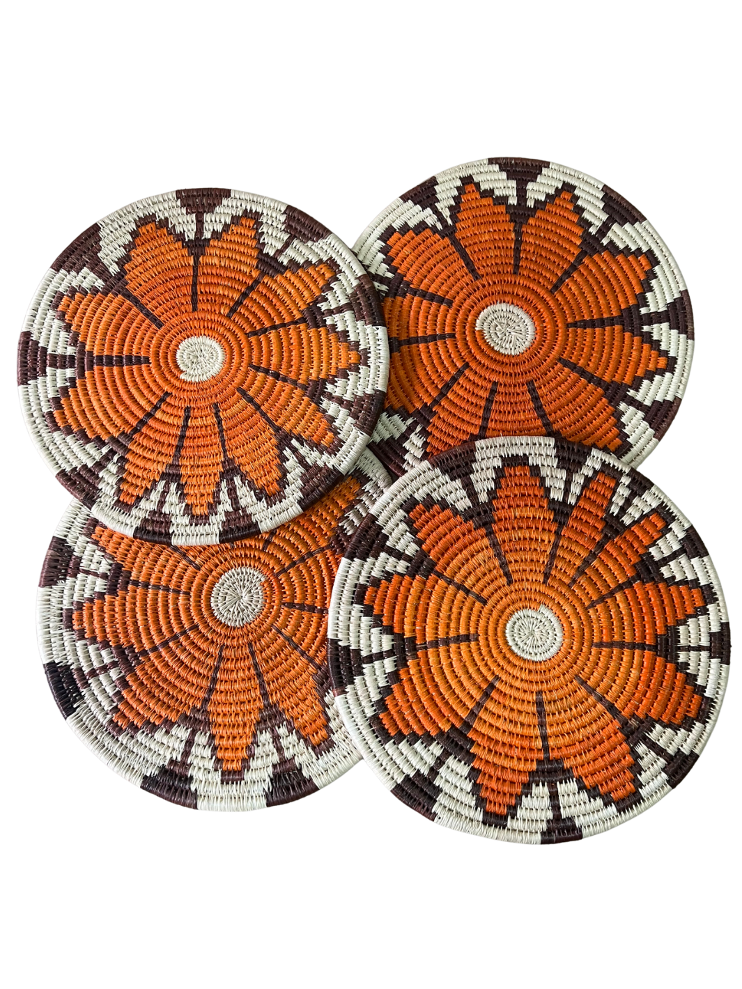 Set de individuales x 4. Elaborados en palma de moriche y cumare por artesanas de la comunidad Sikuani en el departamento del Meta. Tienen un diámetro de 34 cms.