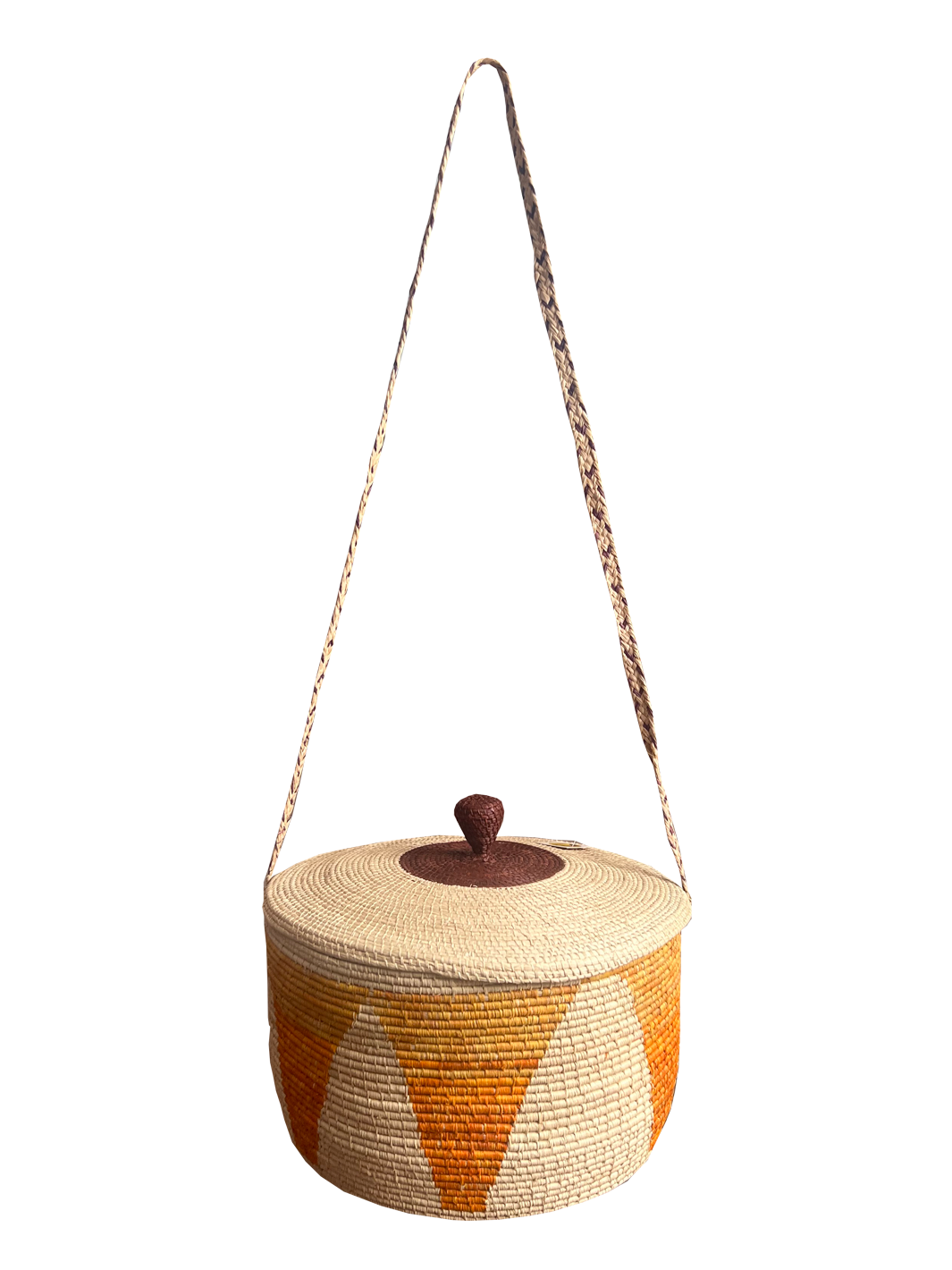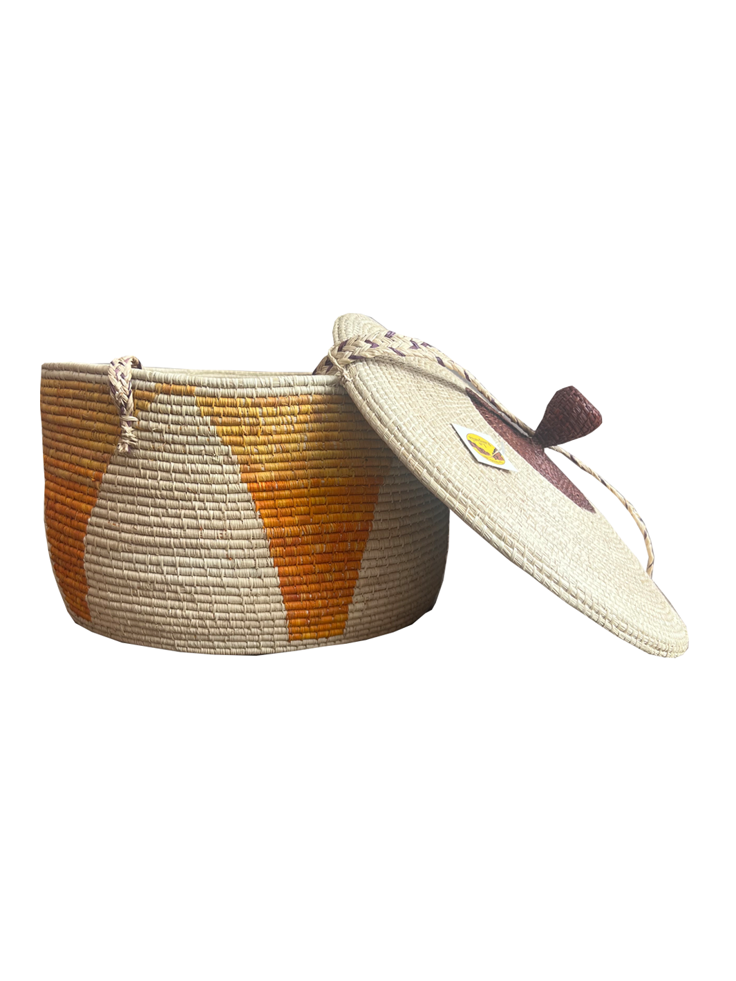 Canasto hecho en palma de moriche y cumare. Elaborado por artesanas de la comunidad Sikuani en el departamento del Meta. Tiene una base inferior con diámetro de 25 cms y una altura de 16 cms incluyendo la tapa.